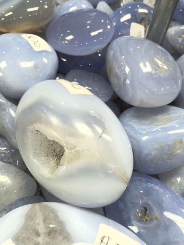 Blue Lace Agate is known for its calming properties and soothing pale blue hues with intricate, unique banding patterns. This gemstone is a stunning addition to any collection or jewelry piece.