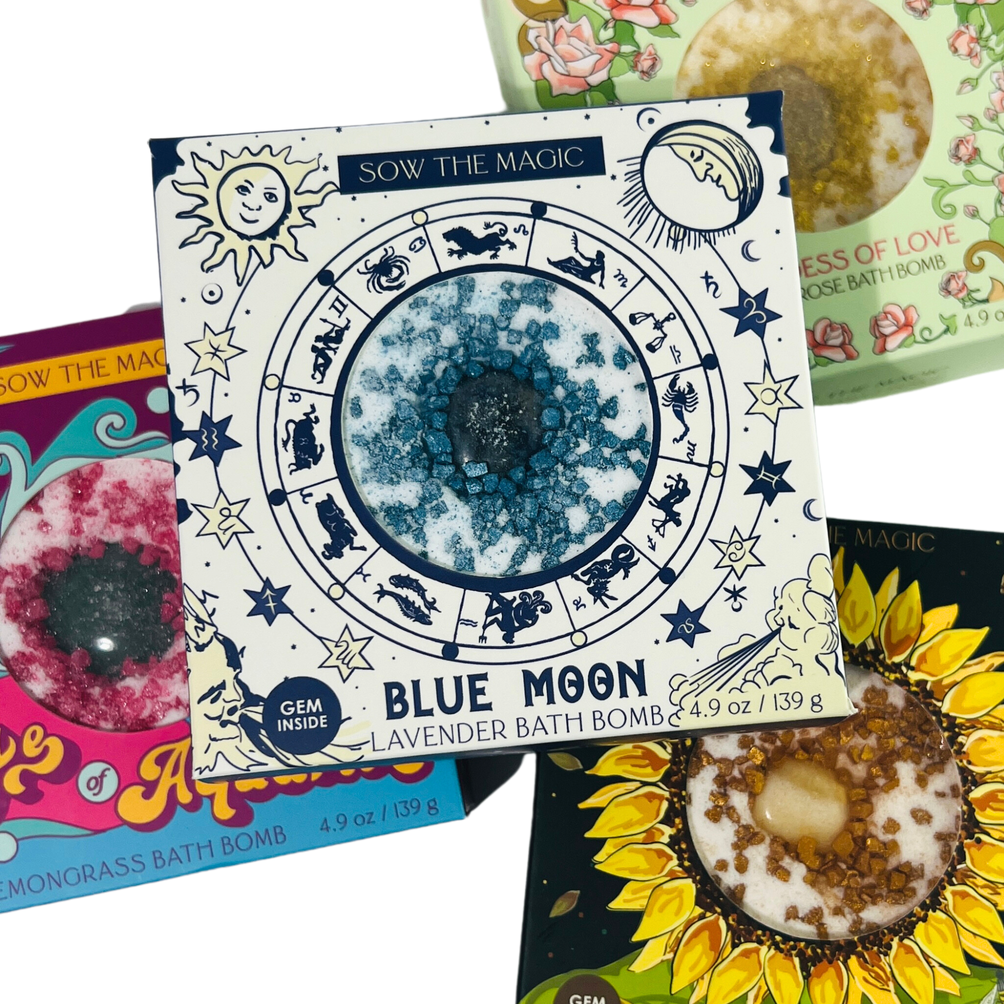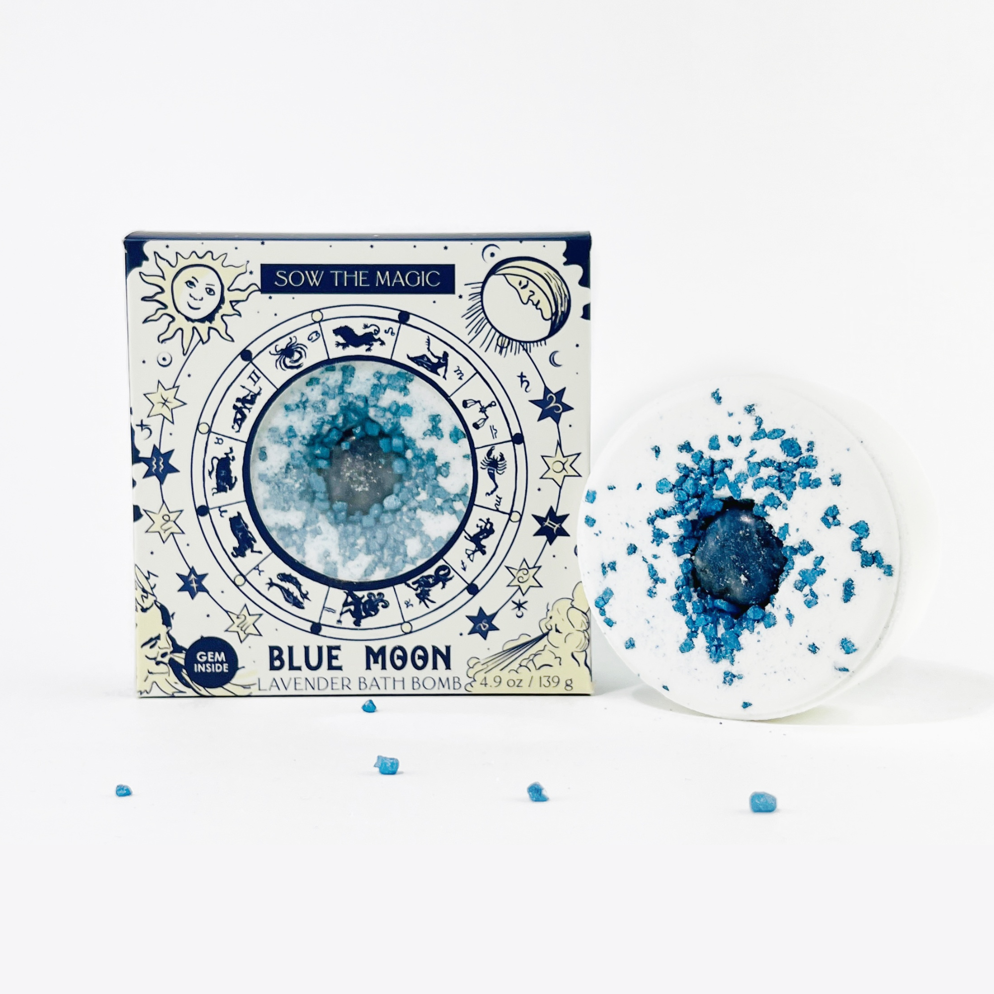 The Blue Moon is a rare celestial event that represents an especially magical time in the feminine cycle of life. Let the winds of change and harmony fill your sails as you relax in this lavender scented bath bomb with a Sodalite gem that promotes clarity and creativity as it inspires confidence and clears your spiritual vision.