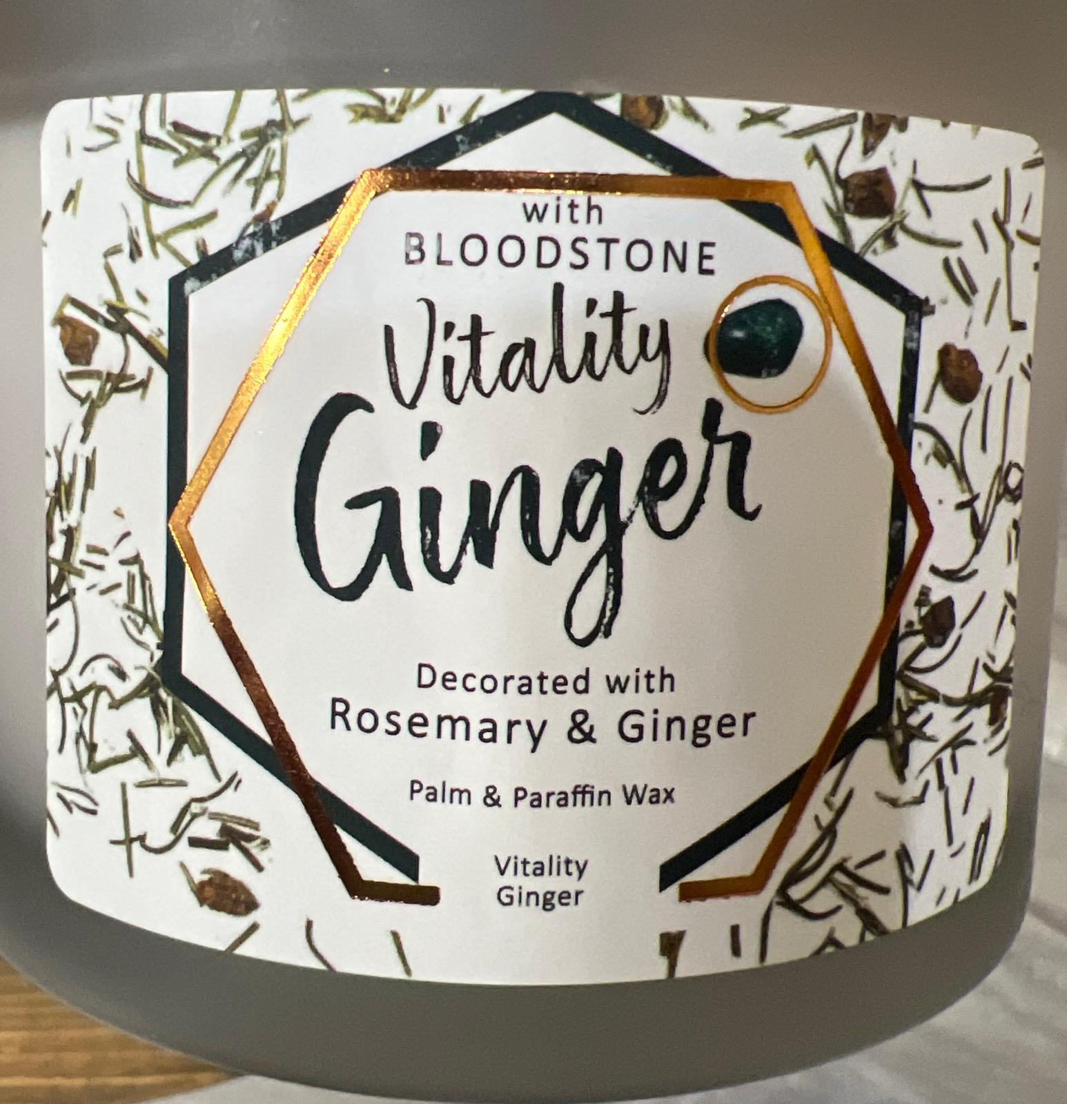 Light this when you want a lift. Spicy ginger and fresh rosemary bring warmth and clarity, while a bloodstone accent often linked with stamina and courage—adds a grounded touch. The surface is finished with ginger pieces and rosemary for a natural, lively look. Great for mornings, creative work, or any time you need momentum.