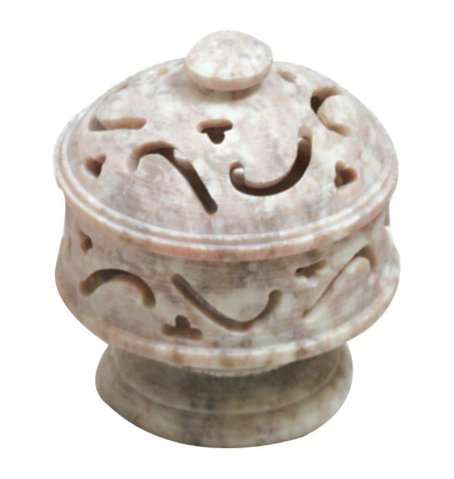 Disco Soapstone Cone/Stick Incense Holder, H=2.25″: Hand carved soapstone holder for both incense sticks and cones. Soapstone is a soft stone, perfect for carving and is 100% fire-proof. Soapstone comes in a variety of colors (sorry we cannot honor color requests). Works for both incense cones and sticks. Turn lid of the holder upside-down to burn incense sticks. Handcrafted by our valued supply partners in India.