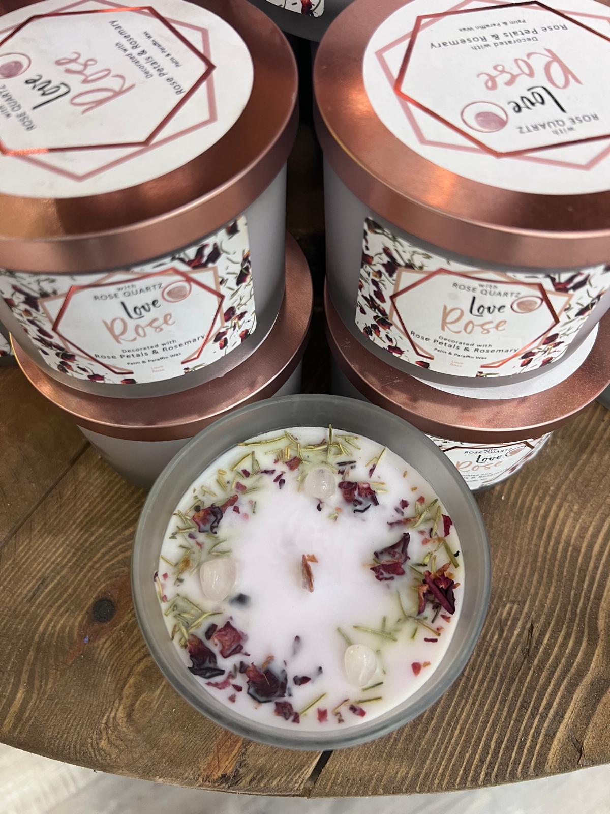 An intention candle for love and calm. Finished with a rose quartz stone and decorated with real rose petals and rosemary in a frosted glass jar.