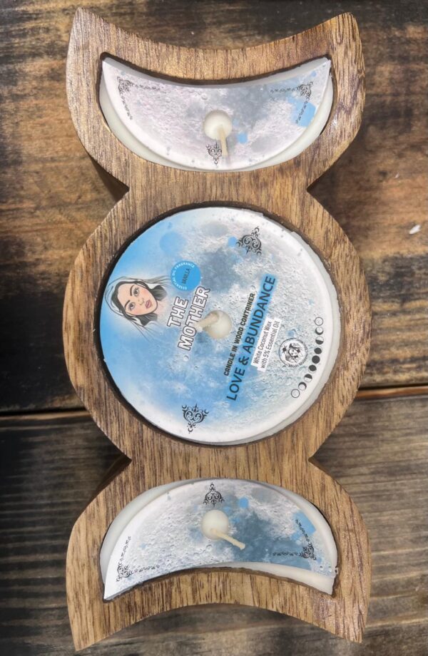 Embrace divine energy and open your heart to love and prosperity with The Mother: Love & Abundance Moon Candle. Hand-poured into a stunning triple moon wooden vessel, this candle symbolizes the cycles of life waxing, full, and waning representing growth, fulfillment, and renewal.