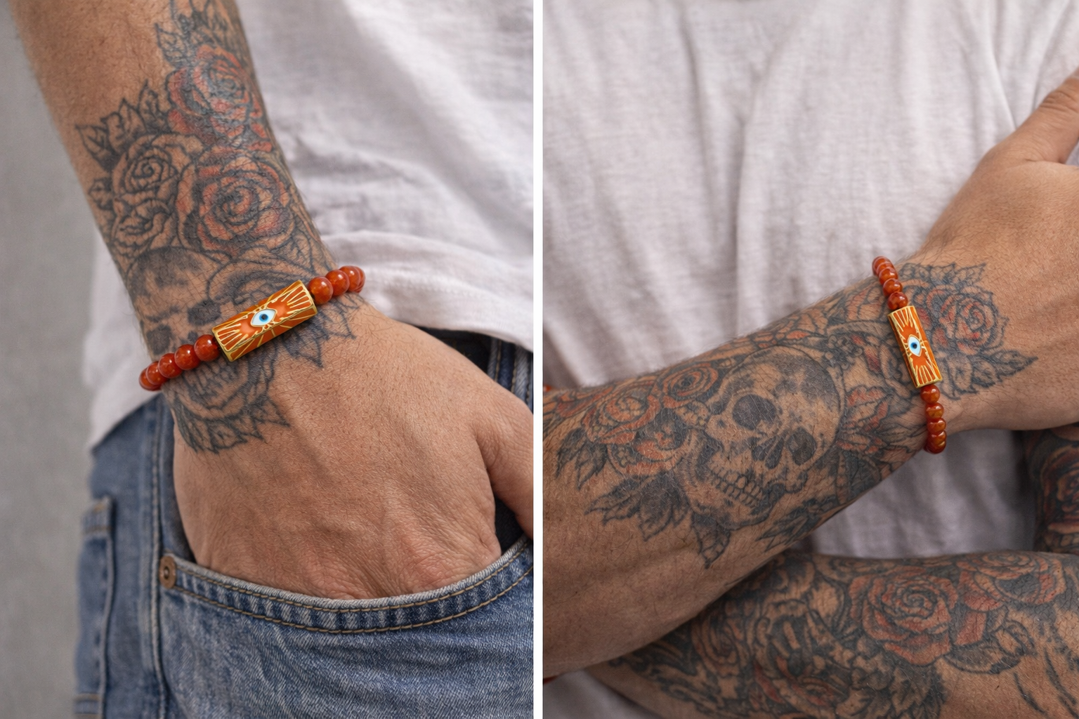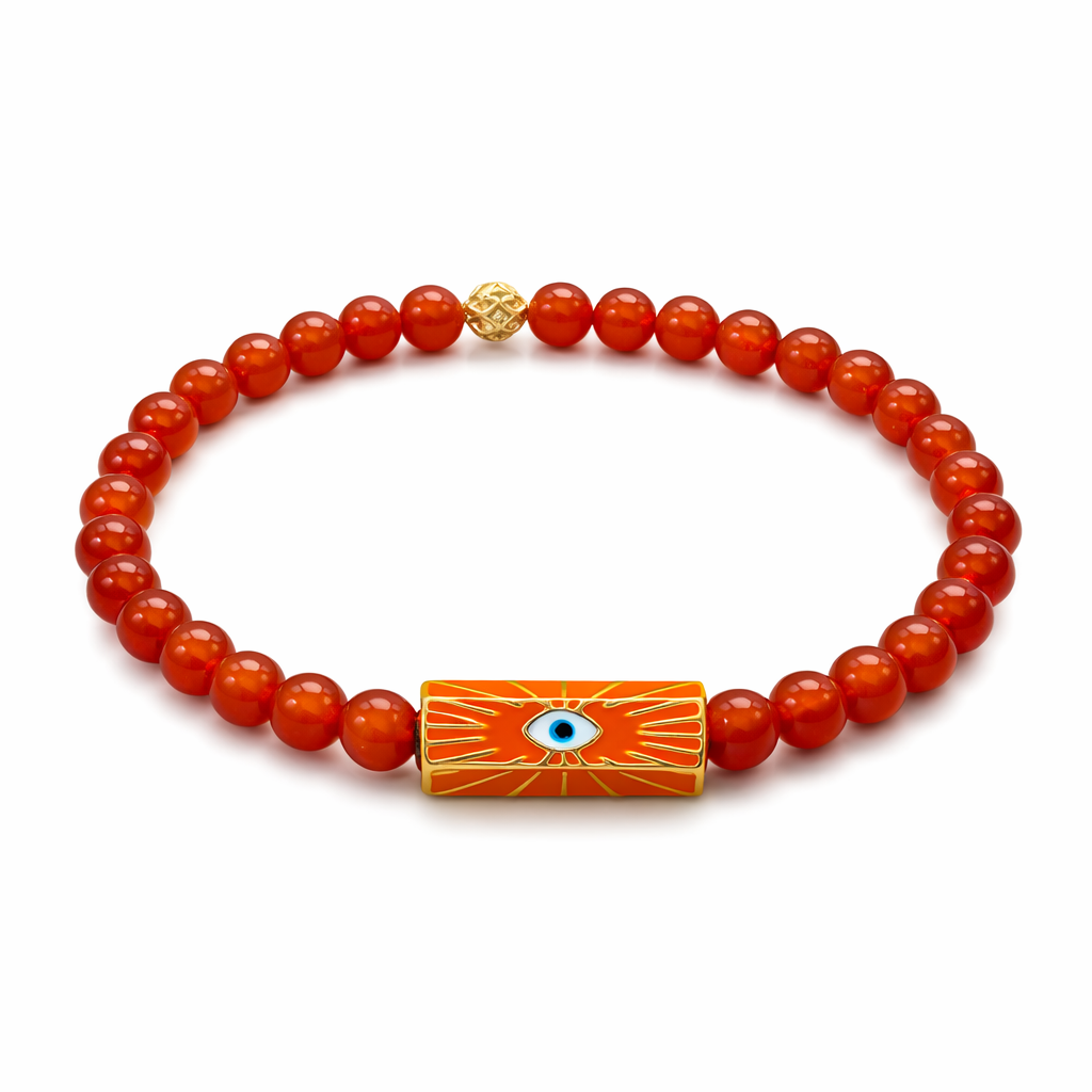 Bold color meets timeless symbolism. This handcrafted bracelet features luminous 6mm red artisan hand-fired glazed glass beads paired with a striking evil eye enamel centerpiece. Accented with turquoise enamel detailing the “evil eye”” and a heart, the design represents love, affection, and positive energy, finished with rich 18K gold plating for a refined touch.