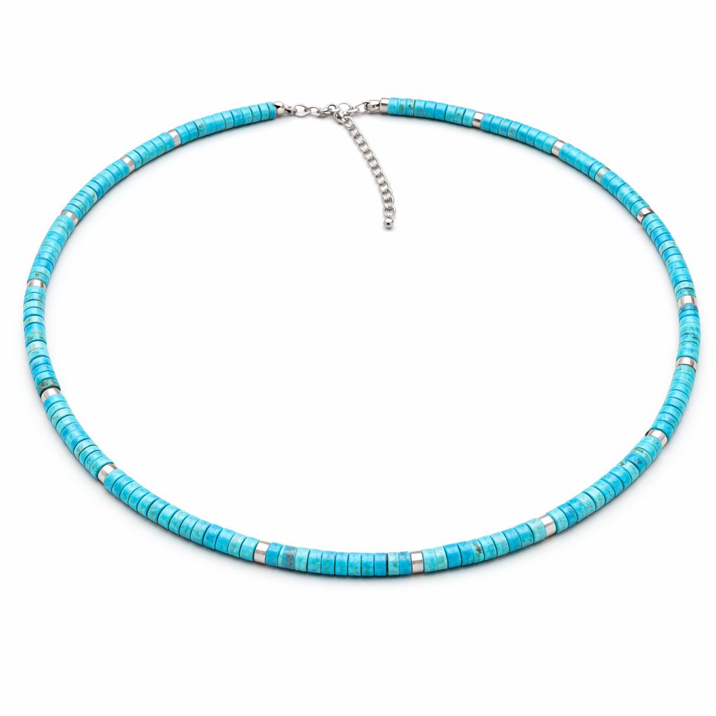 Laid-back vibes with a touch of coastal cool. This handcrafted necklace features vibrant turquoise heishi beads strung in a classic surfer style, accented with subtle silver details. Finished with a sleek stainless steel lobster clasp and an adjustable extension chain, it’s designed for effortless, beach-inspired layering.